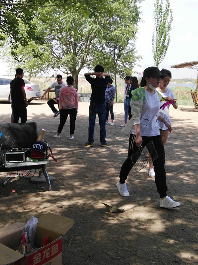 在石桌上鋪上臺布,支上烤架,把前一天串好的羊肉串拿出來,就可以開烤了。主烤人是趙宇,第一輪烤好后,分給大家吃,外焦里嫩,鮮美可口。苗總在另一桌湊了四個人打撲克,另一邊,大家圍成一個圈,一起踢毽子,還有人打羽毛球,跳大繩。這邊歡聲笑語,吃喝玩樂,那邊安謐寂靜,待魚上鉤,張總和另外兩個男生在不遠處的湖邊釣魚,共釣上四條小魚,雖然不多,但釣魚享受的是過程。大家都吃的差不多了,就一起玩摸瞎的游戲。大家圍成一個圈,由一人在中間蒙上眼睛抓人。
